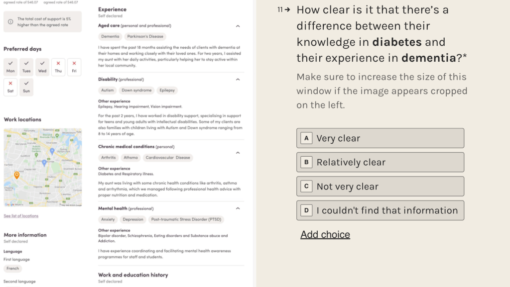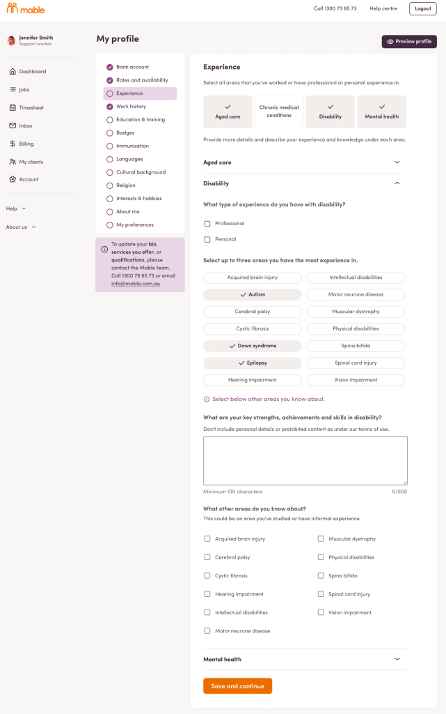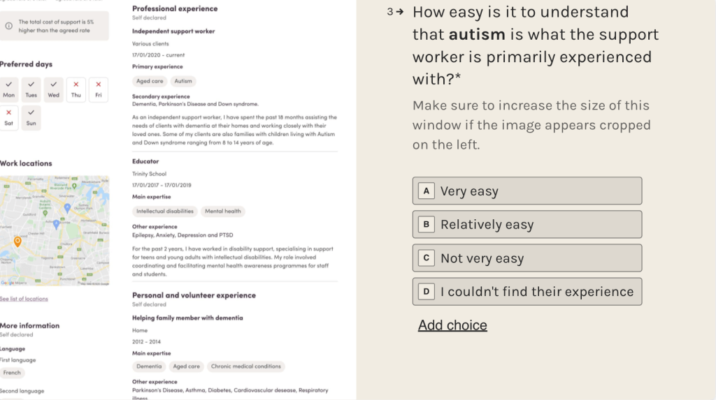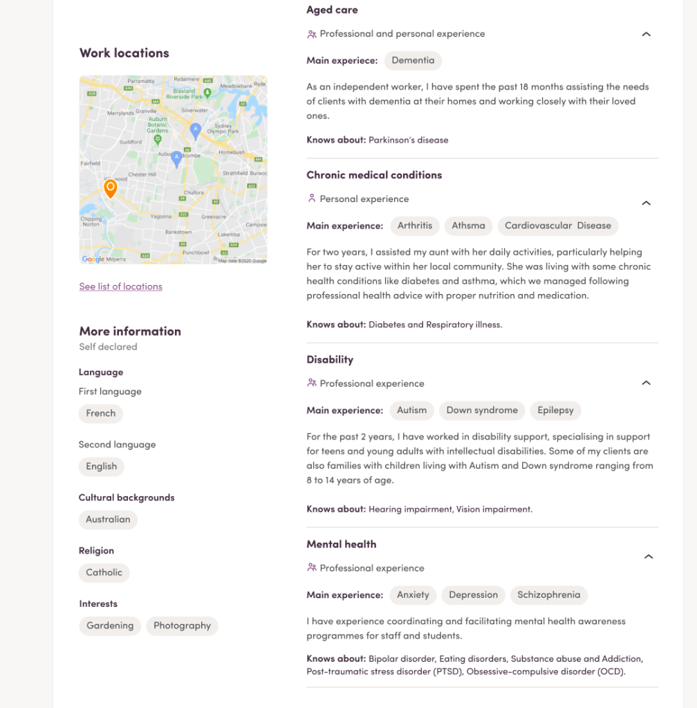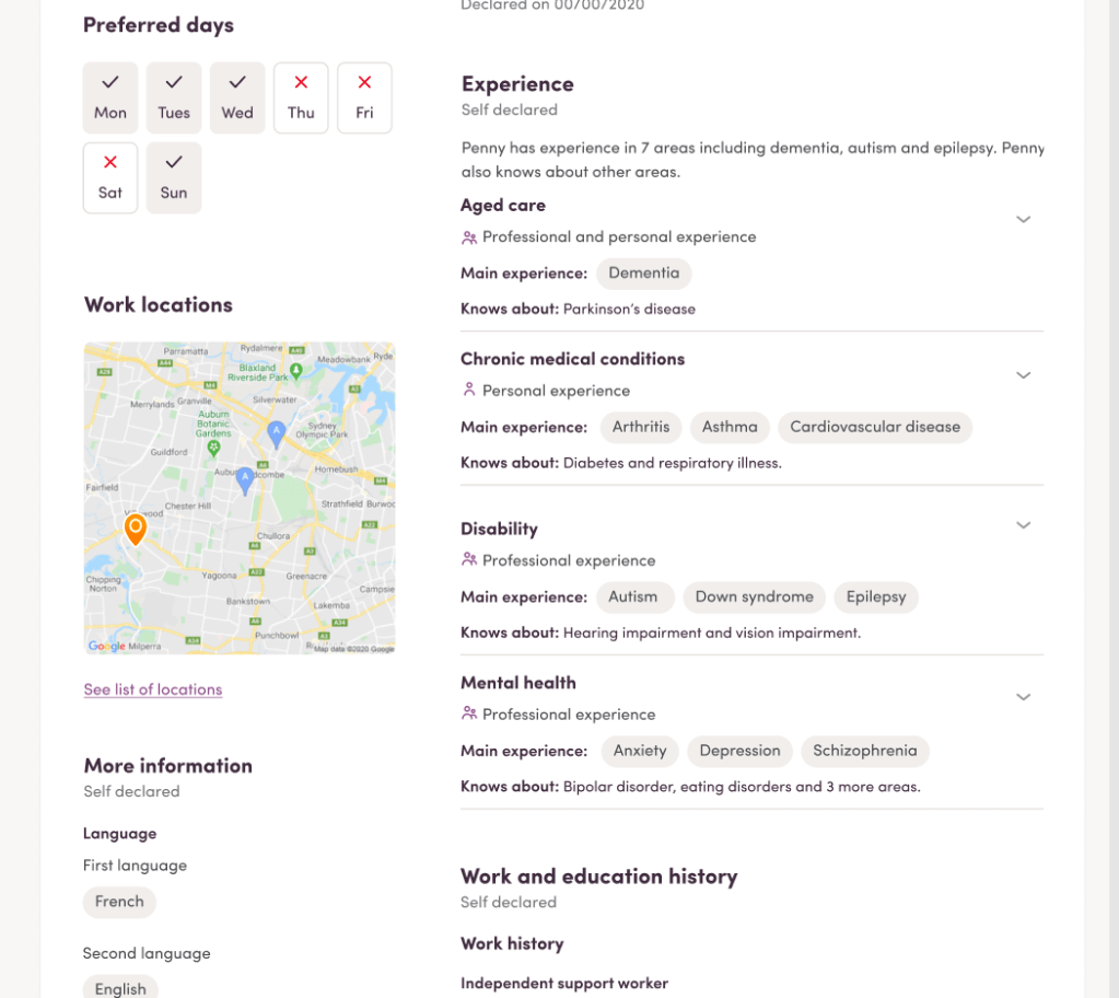 The updated worker profile provides a robust care experience structure for workers to provide only their relevant experience in which they can describe their skills in context. As a result, clients are more confident talking to workers they know have the experience to fulfill their support needs.