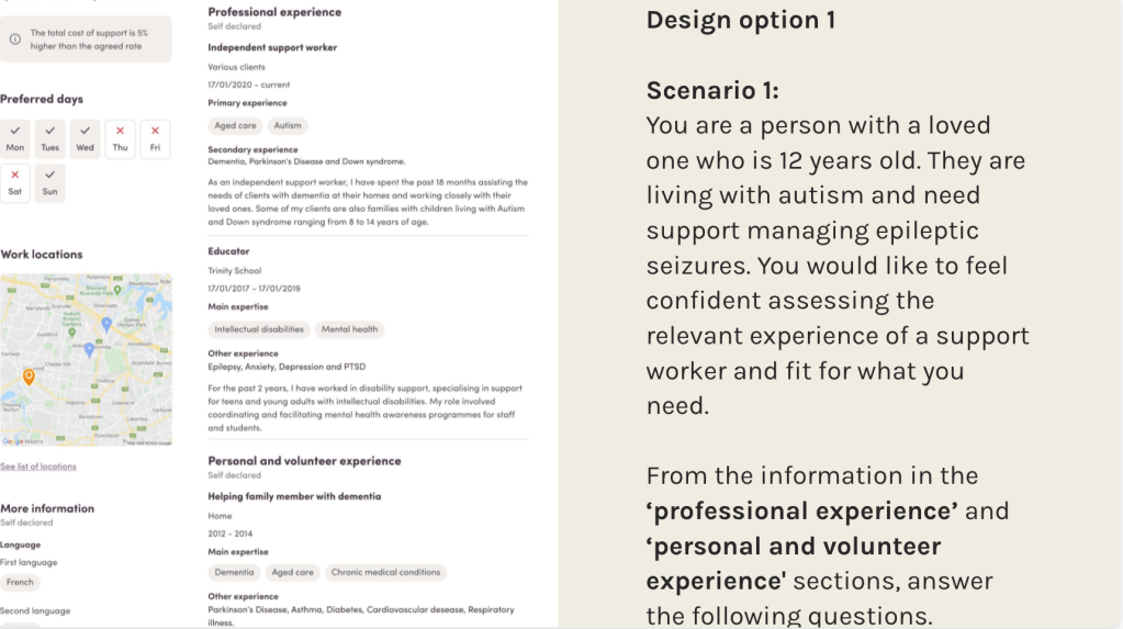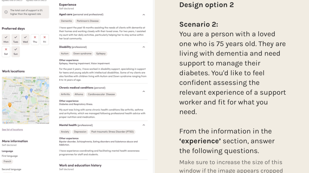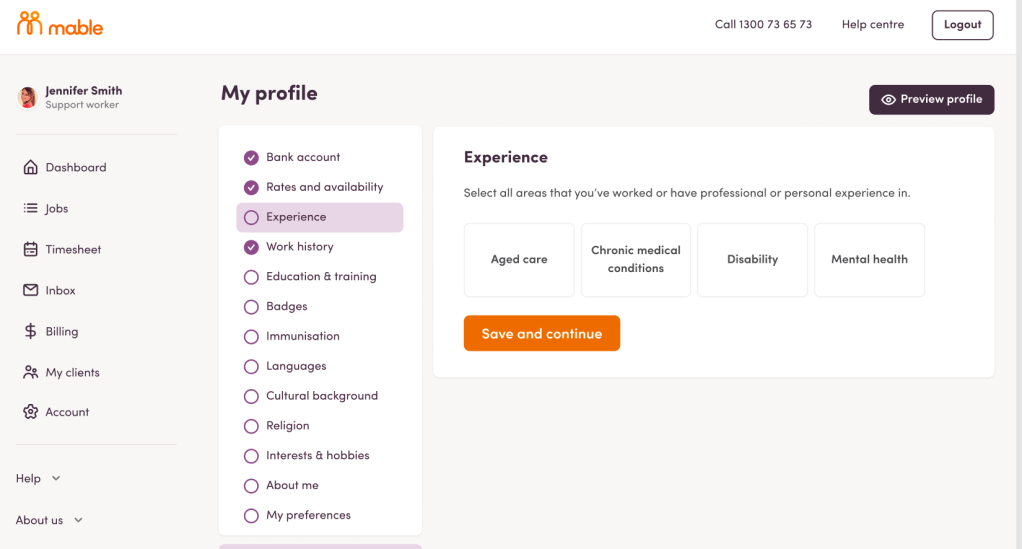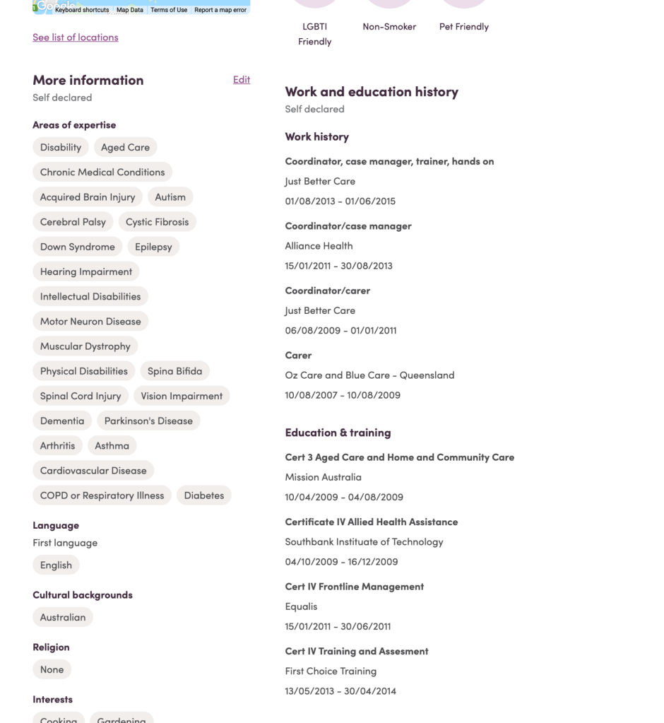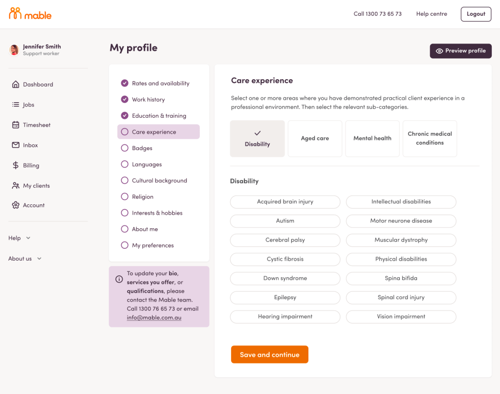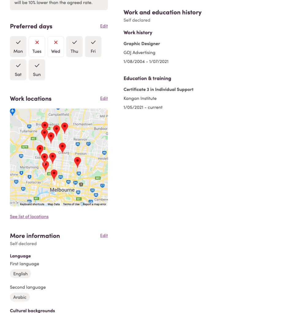 The updated worker profile provides a robust care experience structure for workers to provide only their relevant experience in which they can describe their skills in context. As a result, clients are more confident talking to workers they know have the experience to fulfill their support needs.